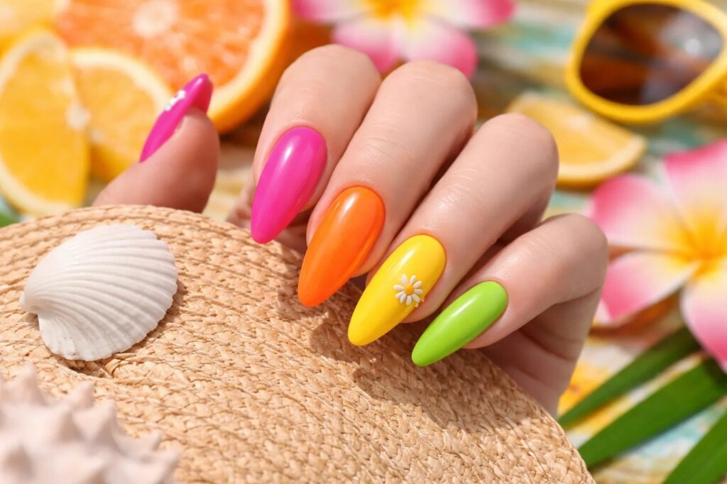 Les Ongles Été 2027 se démarquent par des teintes éclatantes et joyeuses. Le corail, le jaune, le turquoise et le fuchsia sont au cœur des tendances. Les motifs tropicaux, les effets dégradés et les finitions brillantes apportent une touche fun et dynamique. L’été encourage à oser des styles audacieux et colorés.